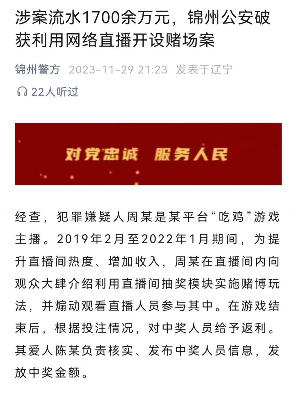 去年年底,锦州警方又通报了一起涉赌案件。犯罪嫌疑人周某、陈某对2019年2月1日至2022年1月12日期间,利用某直播平台组织赌博活动5000余场,参赌资金累计1700余万元、非法获利266余万元。据21世纪经济报道,周某为斗鱼“吃鸡”主播“轻语619”,此前在平台拥有200余万粉丝,被网友称为斗鱼“绝地四子之一”。