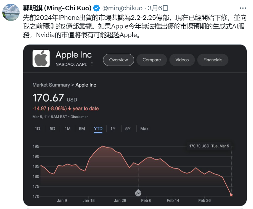 月初,天风证券国际分析师郭明錤在X(前Twitter)上发帖称,“如果苹果今年无法推出优于市场预期的生成式AI服务,英伟达(NVIDIA)的市值将很有可能超越苹果。”