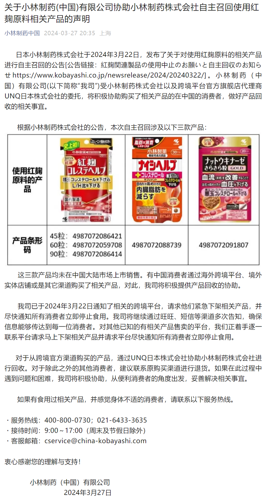 小林制药中国3月27日在官方微信公众号发布声明称,日本小林制药株式会社于2024年3月22日,发布了关于对使用红麹原料的相关产品进行自主召回的公告[公告链接:紅麹関連製品の使用中止のお願いと自主回収のお知らせhttps://www.kobayashi.co.jp/newsrelease/2024/20240322/]。小林制药(中国)有限公司受小林制药株式会社以及跨境平台官方旗舰店代理商UNQ日本株式会社的委托,将积极协助购买了相关产品的在中国的消费者,做好产品回收的相关事宜。本次召回的三款产品均未在中国大陆市场上市销售。有中国消费者通过海外跨境平台、境外实体店铺或是其它渠道购买了相关产品,对此,公司将积极提供产品回收的协助。