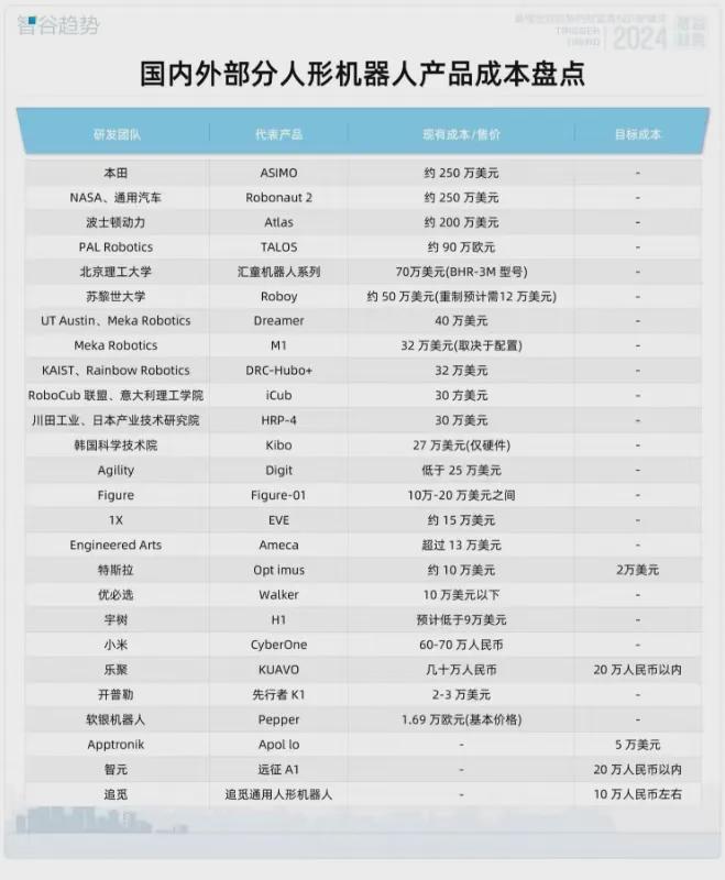 遗憾是的,现在人形机器人造价仍旧没到下一个拐点。有资深业内人士告诉智谷趋势:“能够量产的人形机器人理想成本应该在20万到30万人民币之间”。按照这一说法,市面上四分之三的现有人形机器人产品距离量产都还有距离。