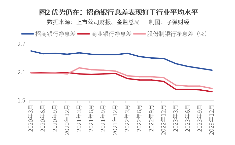 幸而,从净息差的表现来看,招商银行的表现仍好于行业平均水平。2023年报显示,招商银行净息差从年中的2.23%缩减到2.15%。虽然是继续承压,但从绝对值来看,仍高于金监总局公布的商业银行和股份制银行2023年净息差,即1.69%和1.76%。