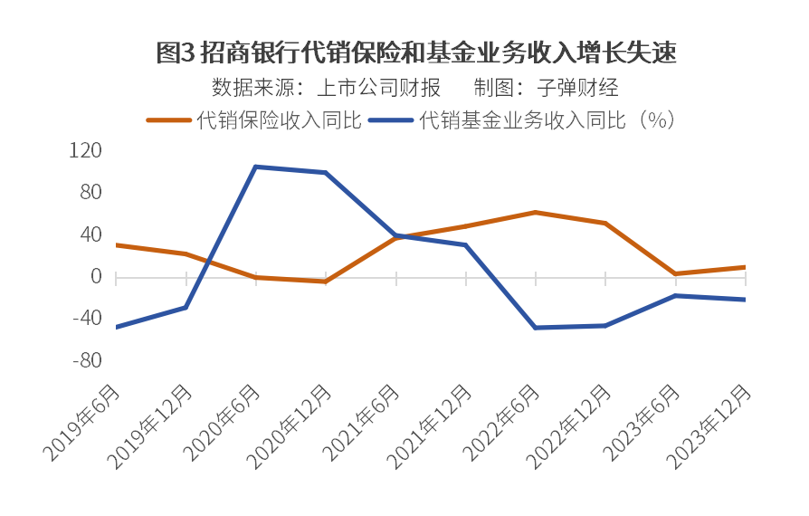 数据直观显示出,招商银行代销保险、代销基金这两类财富业务已经告别了高增长时代。2023年年报显示,招商银行代销保险、代销基金业务分别录得135.85亿元和51.79亿元的收入。保险代销收入同比增速从35%—60%的水平回落到9.33%,基金代销收入更是已经开始同比缩减。