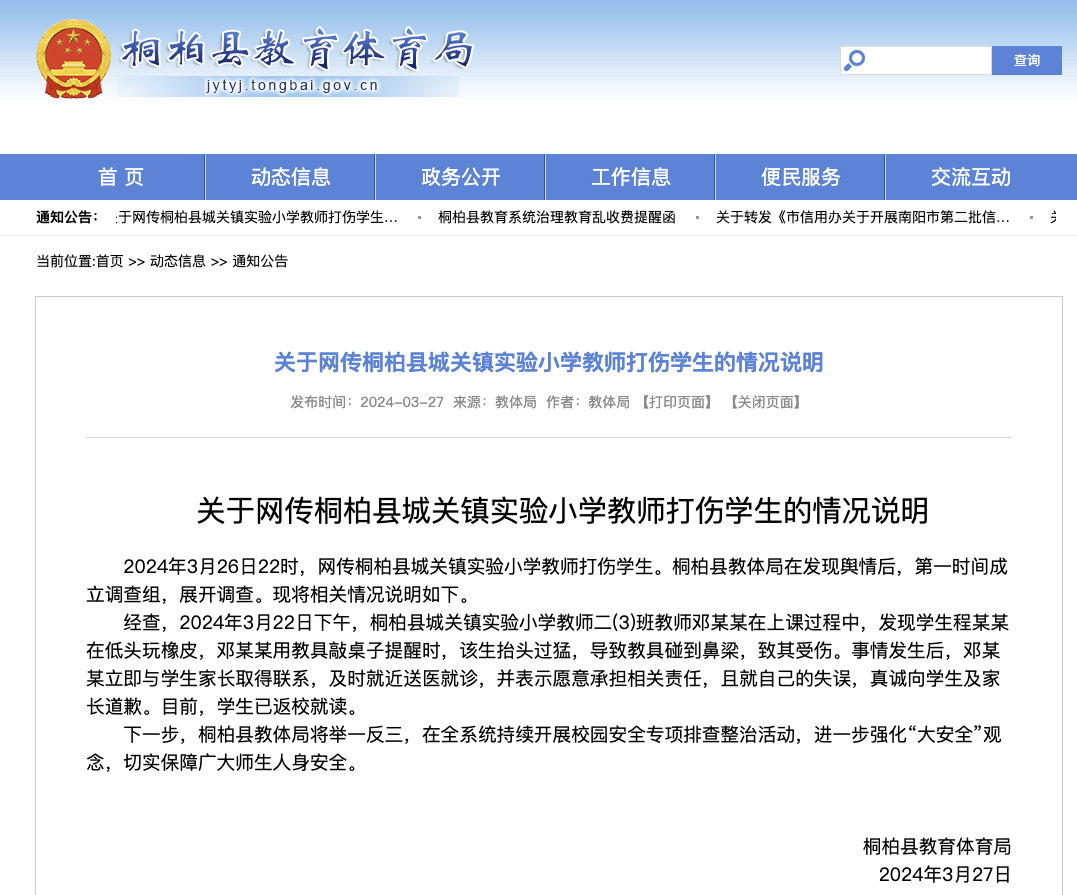 桐柏县教育体育局发布《关于网传桐柏县城关镇实验小学教师打伤学生的情况说明》,具体内容如下: