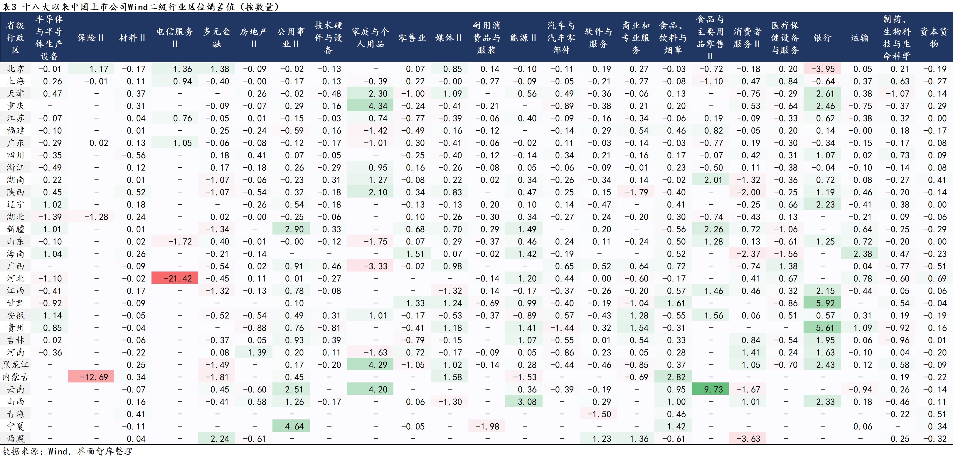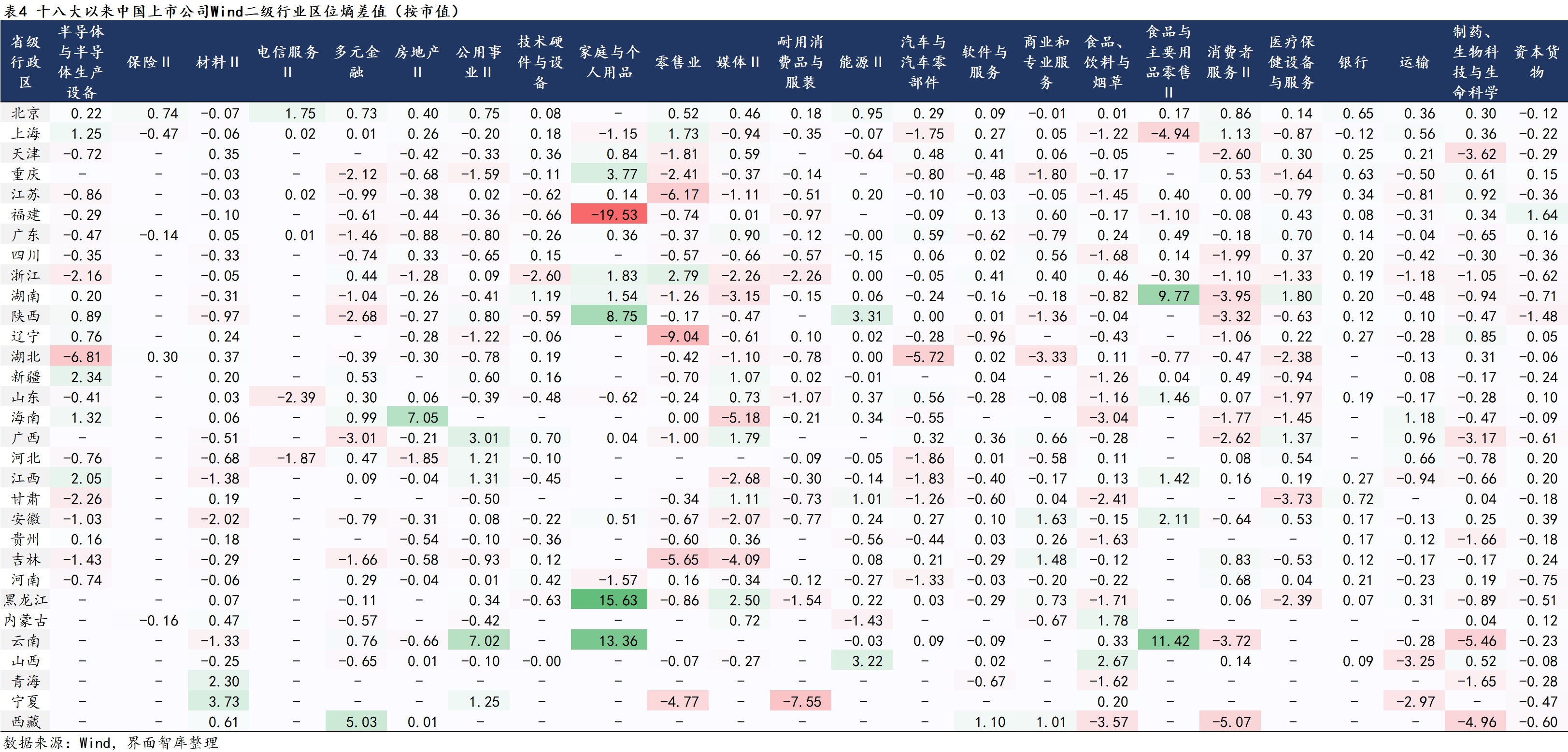 通过对具体上市公司的查询发现,内蒙古的保险II仅为昙花一现,其在保险业的唯一上市公司在十九大期间退市。河北的电信服务II一共有两家上市公司,其名次大幅滑落缘于这两家公司分别在十八大期间以及二十大期间退市。云南的食品与主要用品零售II里主要包含3家上市公司,在十八大期间新增1家,十九大期间新增2家;宁夏的公共事业II里也包含3家上市公司,主要涉及新能源发电业和燃气,其中在十八大和十九大期间各自新增1家;甘肃和贵州的银行业分别拥有2家上市公司,性质均为区域性银行,其中甘肃的2家均在十九大期间上市,贵州的在十八大和十九大期间各自新增1家。