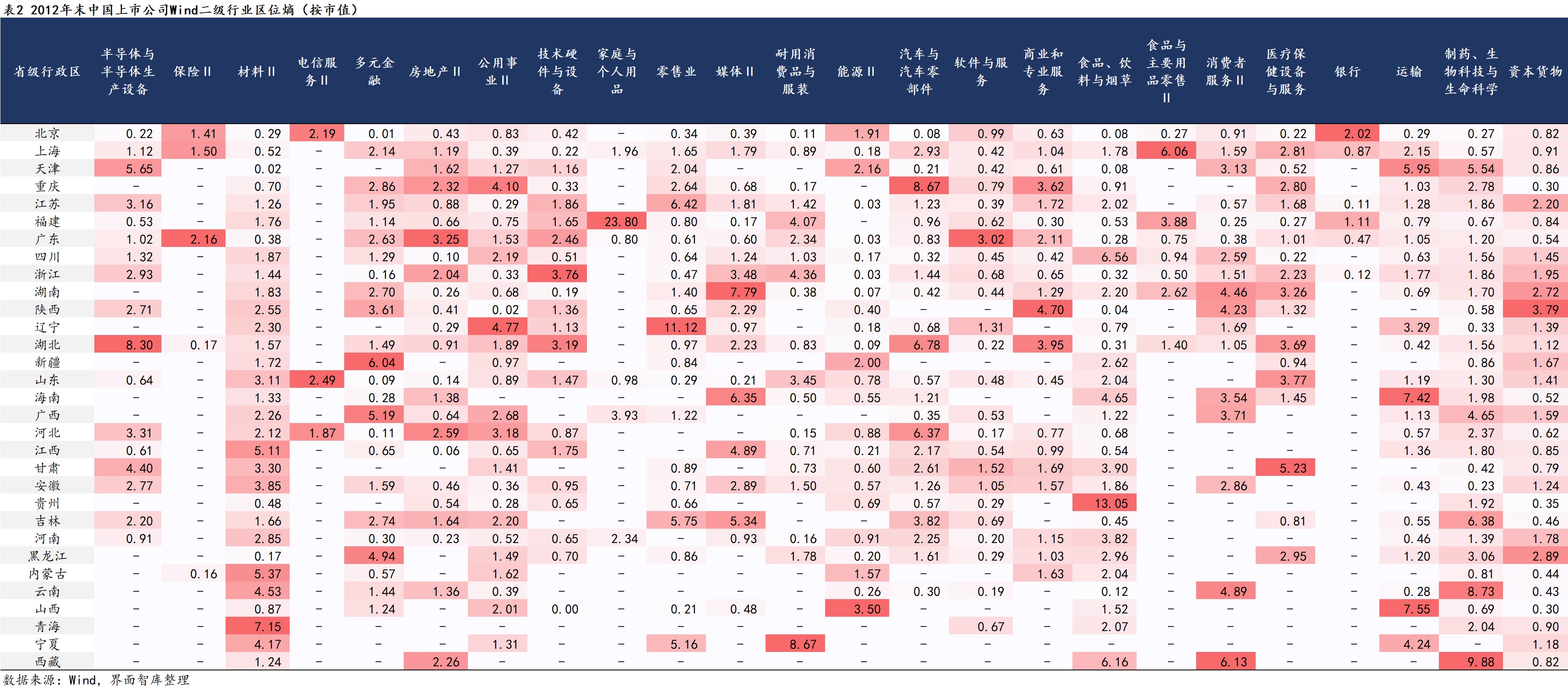 从“市值区位熵”来看,共有8个省市对应的8个行业在这十一年间连续保持领先地位,包括广东的软件与服务,北京的银行,重庆的汽车与汽车零部件,湖南的媒体II,陕西的商业和专业服务,新疆的多元金融,贵州的食品、饮料与烟草,山西的能源II。
