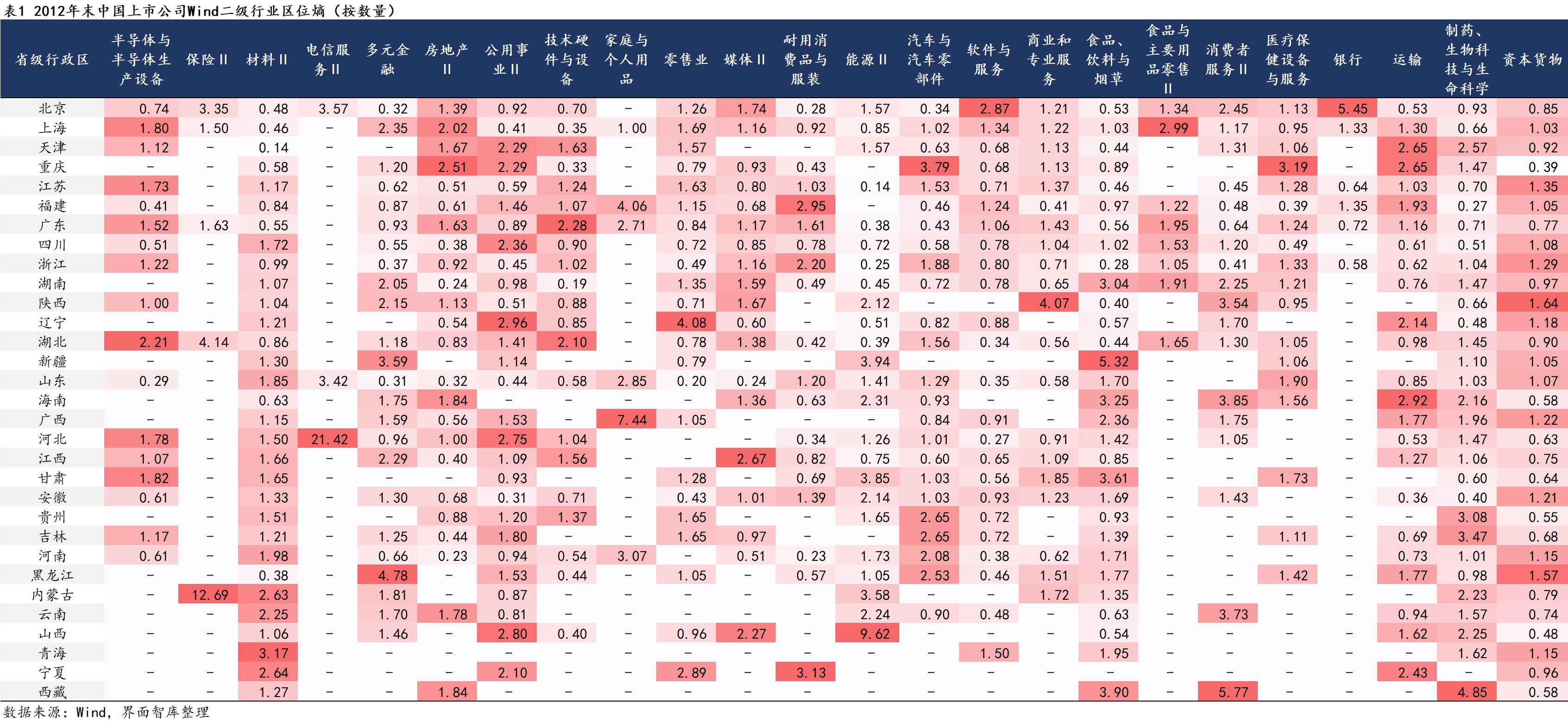 分地区来看,在2012年末,重庆拥有“数量区位熵”第一的行业最多,分别是房地产II(2.51),汽车与汽车零部件(3.79),医疗保健设备与服务(3.19),而且将这3个行业的集聚度优势保持到了2023年末。