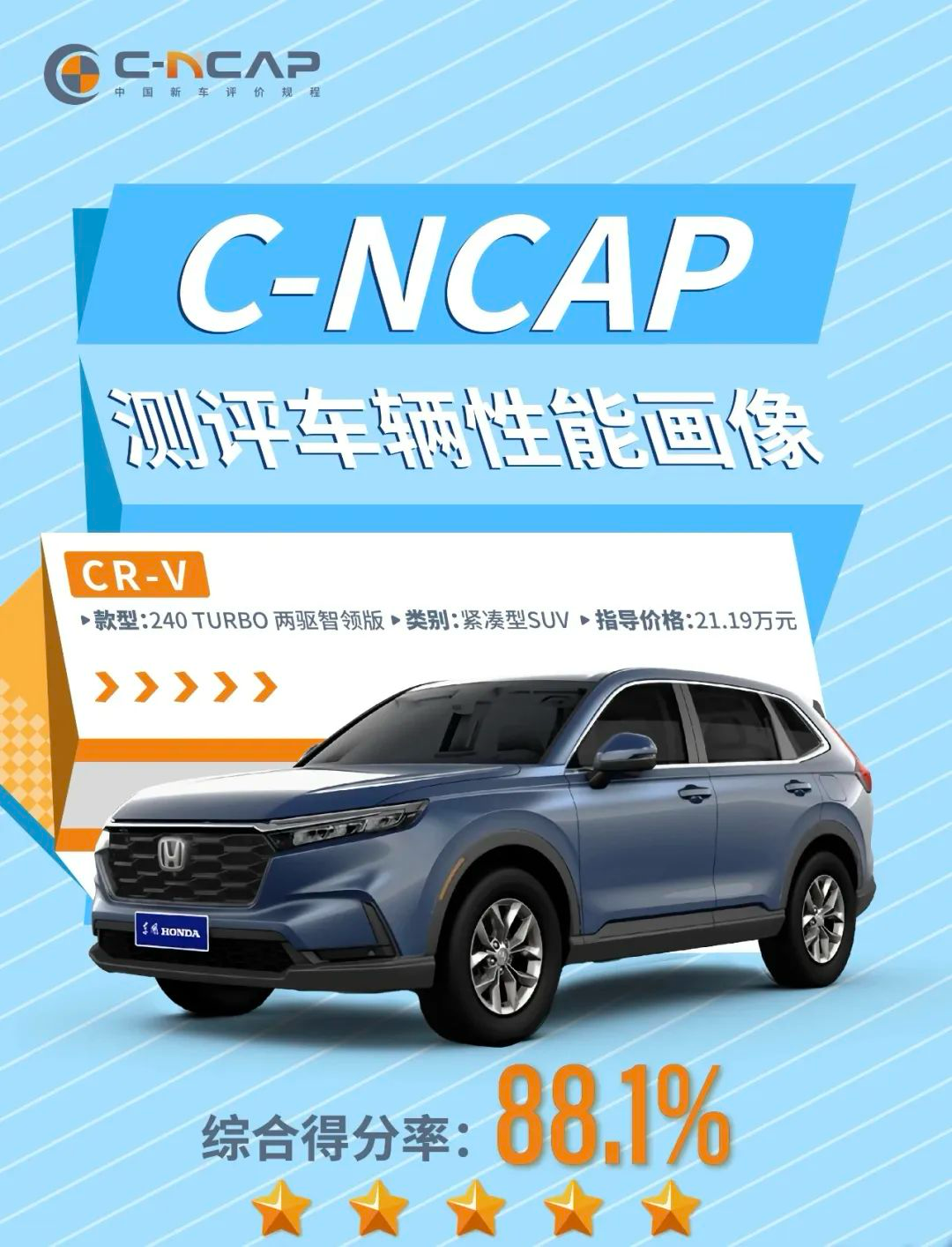 同样对于东风本田而言,将CR-V车型引入国内,也要保持车辆的生产制造标准,毕竟车最重要的是安全。而东风本田也没有让我们失望,CR-V在国内外碰撞测试中多次荣获五星安全评级,并成为C-NCAP历史上第一个“五星+”的SUV车型,2023年6月7日,中国新车评价规程(C-NCAP)测试公布,全新一代CR-V以综合得分率88.1%的成绩荣获C-NCAP五星安全评级,在所有已发布的紧凑型SUV中位居前列。