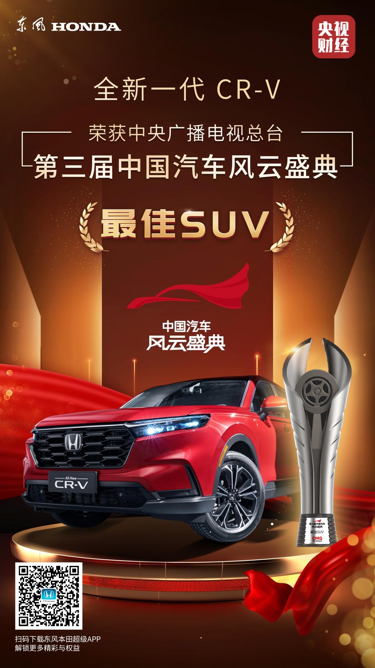 除了销量上的遥遥领先,CR-V还两度获得央视认可,2020年,东风本田CR-V荣获央视总台《2020中国汽车风云盛典》的“年度最佳SUV”。2023年4月7日,在中央广播电视总台主办,总台财经节目中心特别策划的第三届“中国汽车风云盛典”中,东风本田全新一代CR-V凭借卓越品质和优秀口碑,再次斩获“最佳SUV”大奖。