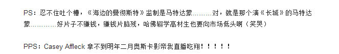 片中兰蒂与男主李多年后再次在海边的曼彻斯特大街上相遇时,兰蒂叫住了李,两个人发生了一段关于原谅与救赎的对话,而这段对话更是被一些网友誉为“2016年最精彩的一段对手戏”: