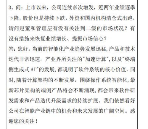 中科创达并没有正面回答该提问,表示:“我们依然看好公司在智能产业链中的机会和未来发展的广阔空间。”