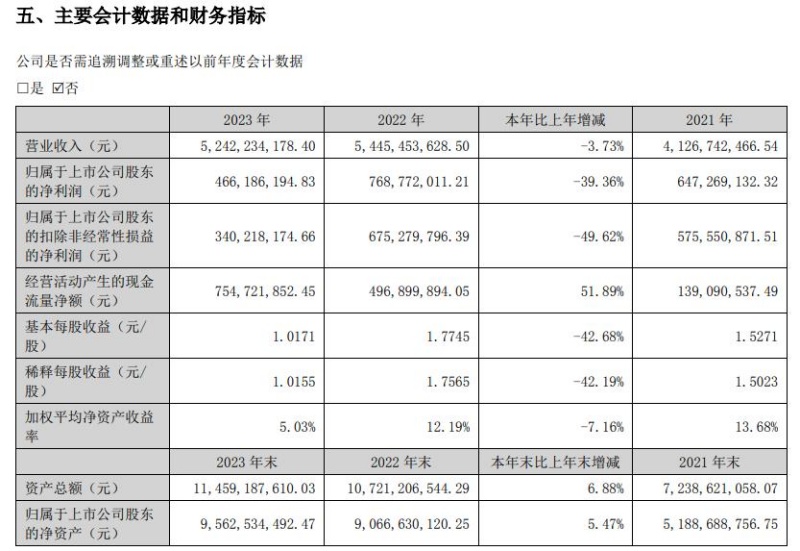 和2021年度相关数据对比,虽然2023年度的营业收入较高,但是归属于上市公司股东的净利润及扣非后净利润均低于2021年度的同项金额,差距分别为1.81亿元和2.35亿元。