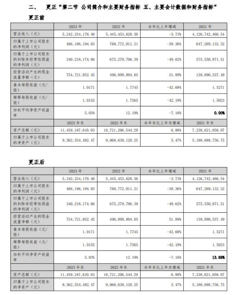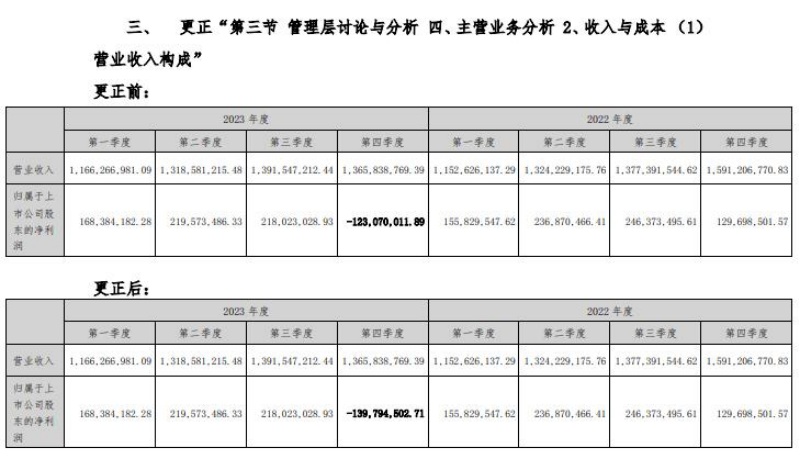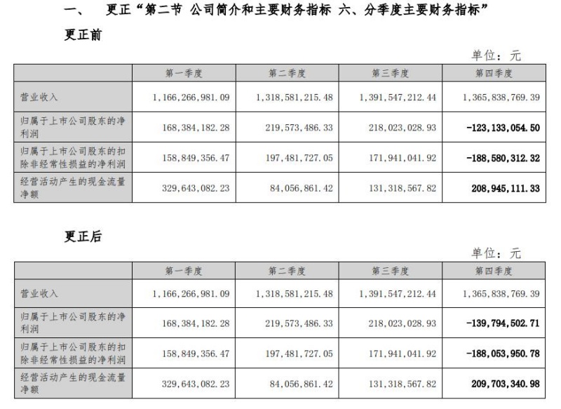 其中,第一项更正是2023年年报的“第二节公司简介和主要财务指标”的“六、分季度主要财务指标”,对第四季度的归属于上市公司股东的净利润、归属于上市公司股东的扣除非经常性损益的净利润和经营活动产生的现金流量净额均做了更正。