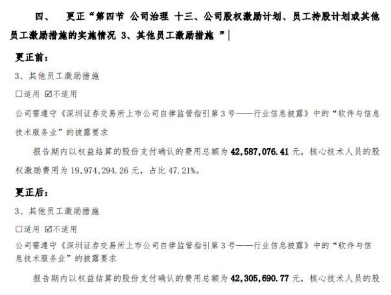 第四项更正是对“第四节公司治理”的“十三、公司股权激励计划、员工持股计划或其他员工激励措施的实施情况”中“3、其他员工激励措施”的“报告期内以权益结算的股份支付确认的费用总额”做了更正。