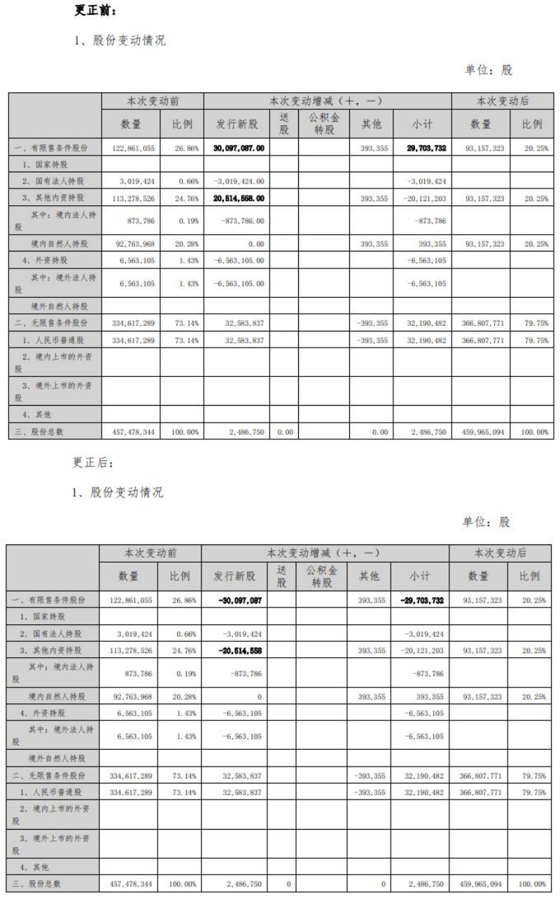 第五项是“第七节股份变动及股东情况”的“一、股份变动情况”之中“1、股份变动情况”的更正,对“本次变动增减”的“发行新股”列、“小计”列的“一、有限售条件股份”,以及“发行新股”列的“3、其他内资持股”进行了更正。