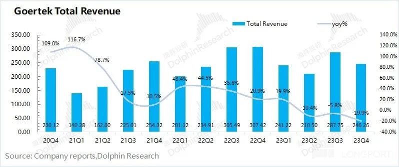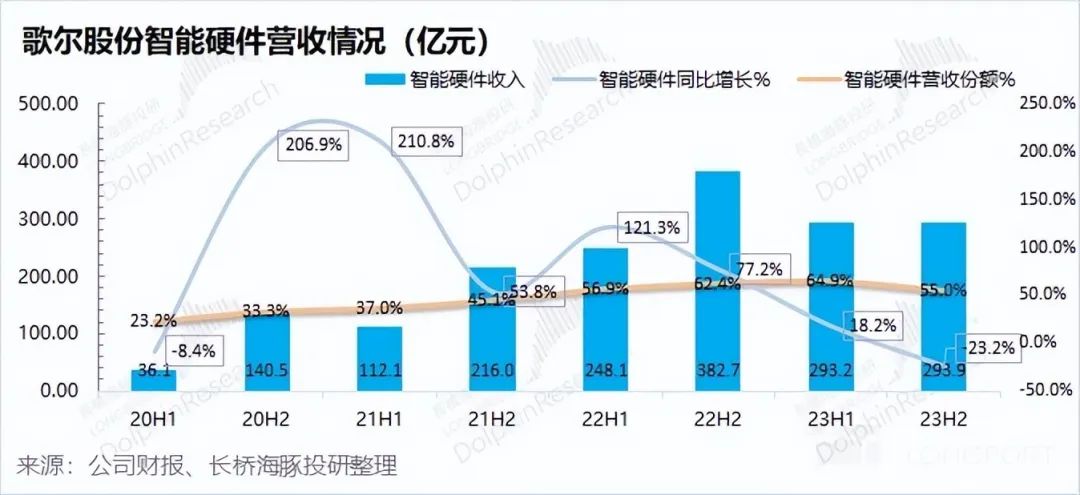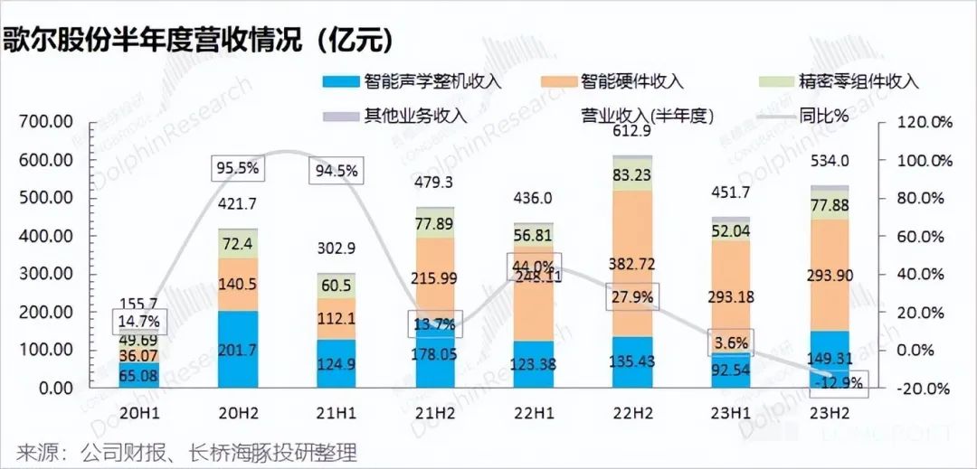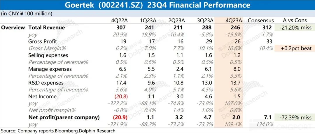 歌尔股份 2023 年第四季度总营收 246 亿元,同比下滑 19.9%,低于市场预期(312 亿)。营收下滑,主要受智能硬件和精密零组件业务下滑的拖累。