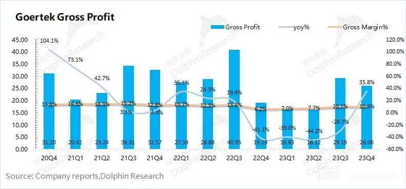 歌尔股份 2023 年第四季度实现毛利 26.06 亿元,同比增长 35.8%,毛利的下滑主要由毛利率大幅下滑所致。