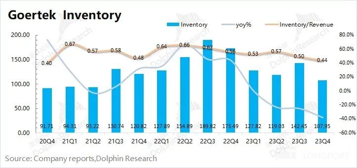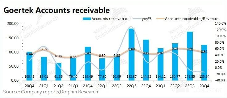 ①应收帐款:歌尔股份 2023 年第四季度应收帐款 125.64 亿元,同比下滑 12.9%。从应收帐款/营业收入指标看,歌尔股份本季度为 0.51,维持在相对合理水位。