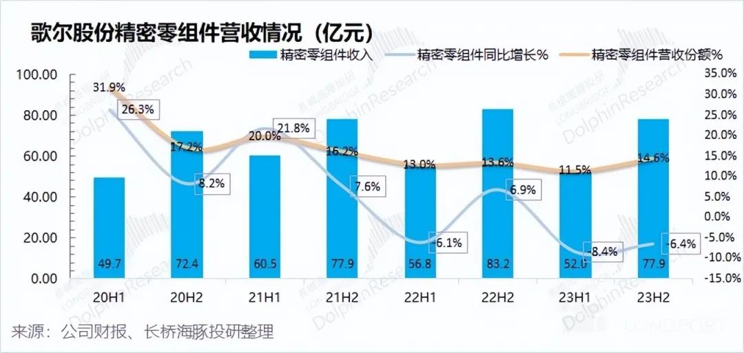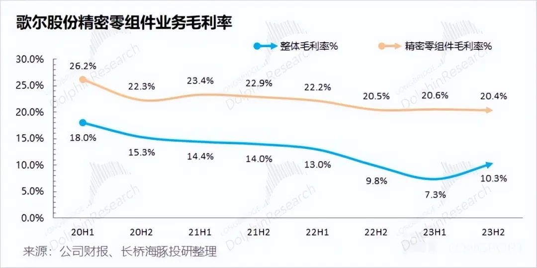 歌尔股份精密零组件业务 2023 年下半年毛利率为 20.4%,同比下滑 0.1pct。公司精密零组件毛利率整体稳定在 20% 左右水平。