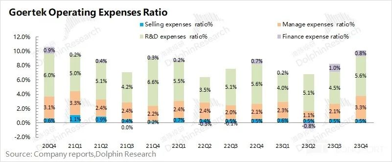 2023 年第四季度歌尔股份四项费用合计 24.92 亿元,同比减少 9.2%。四项费用率 10.1%,四项费用率的下滑主要来自销售费用和研发费用的减少。