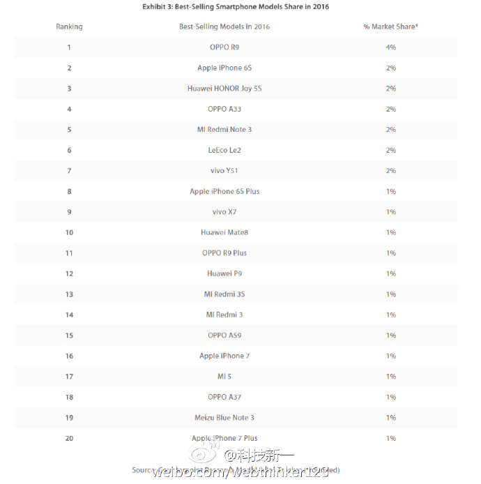 据Counterpoint数据显示OPPO在中国市场的份额增长109%,位居第一,OPPO R9成为2016年国内最热销手机,也因为R9s发热热销,使得OPPO迅速调整销售预期,向两岸产业链紧急要货,抢先上调2017年第1季度手机销售预期。