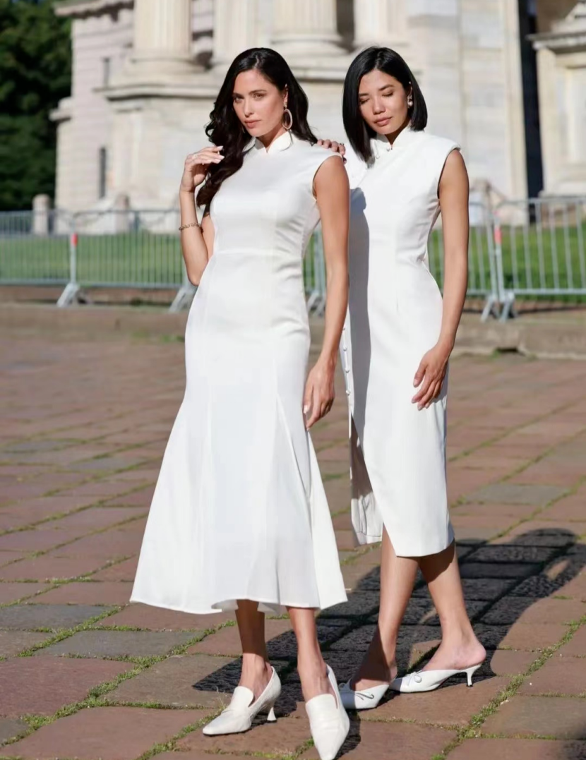 于是Mei把纯色极简的现代风格融入传统旗袍中去,坚持做过膝的裙子长度,最大限度地保留中式旗袍的优雅感受。