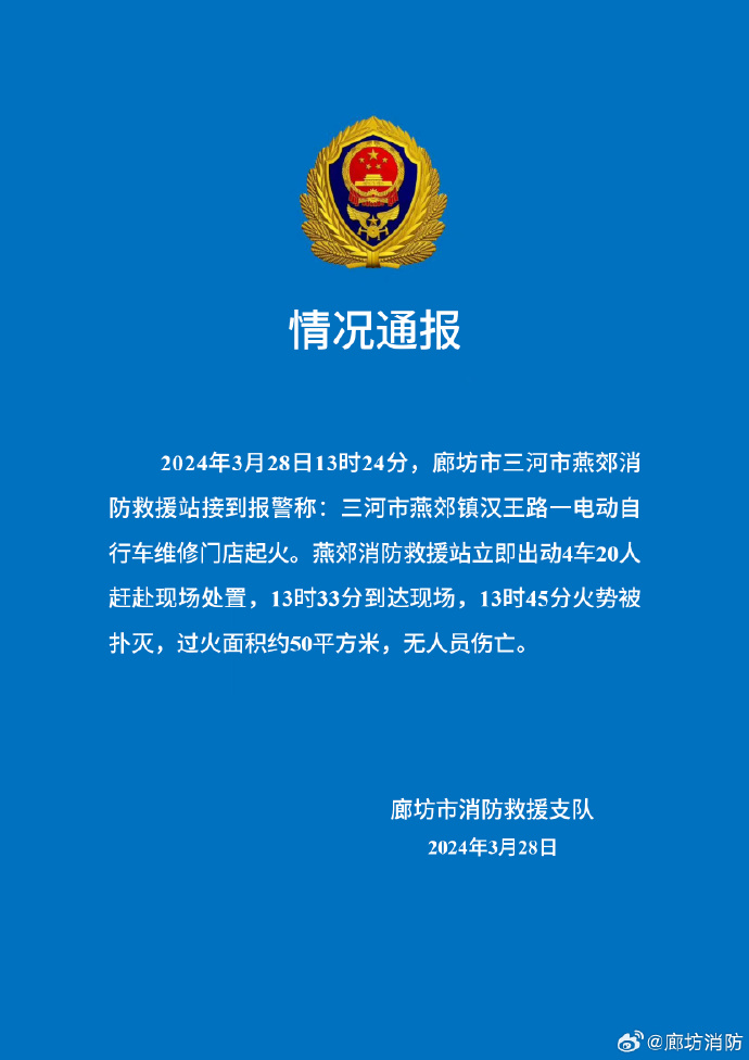 @廊坊消防 通报,3月28日13时24分,廊坊市三河市燕郊消防救援站接到报警称:三河市燕郊镇汉王路一电动自行车维修门店起火。燕郊消防救援站立即出动4车20人赶赴现场处置,13时33分到达现场,13时45分火势被扑灭,过火面积约50平方米,无人员伤亡。