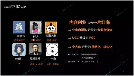 图中这6个账号是2016年最具代表性的新媒体账号,最低的估值是十点读书3000万,其他的PAPI、逻辑思维、一条、同道大叔估值都在三亿人民币以上,其中咪蒙头条价格据传从年初的40万一条涨到了百万、一条的视频成本在130万左右(被官方否认)。他们的特征都是属于自媒体内容范畴。