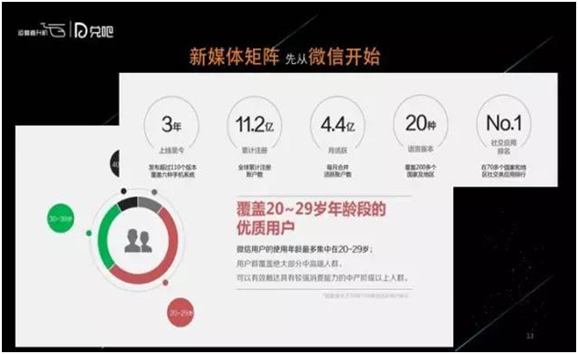这个图片是2014年微信官方出的版本,累计注册用户是11.2亿,每月合并活跃帐户是4.4亿,它覆盖了目前非常优质的一个用户群体。2016年最新的数据是用户日活是8亿,当今所有社交产品里面毋庸置疑的NO1。不管是从用户数、活跃率、还是人群的划分,都是首选。