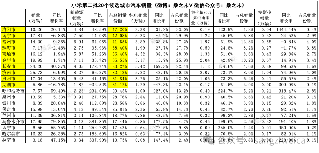 建议:小米第二批备选城市中,可以考虑新能源市占率居前的十个城市,如洛阳、南京、常州、珠海、南通、金华、长春、济南、贵阳、芜湖等;如果考虑新能源销量因素,可以剔除芜湖,增加泉州。这些地区的新能源车市占率和销量增长显示出较高的市场接受度和潜力。