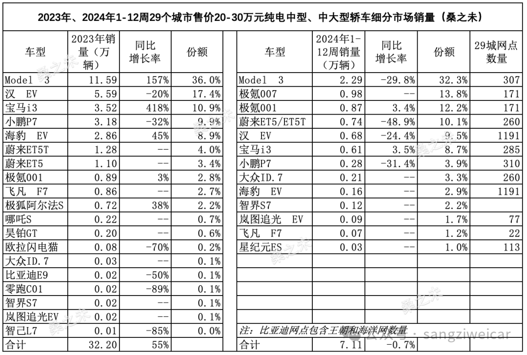 2023年29个城市售价20-30万元,纯电中型轿车和中大型轿车这两个细分市场销量为32.2万辆,同比增长55%,其中特斯拉Model 3占整体份额的36%,其次是比亚迪汉EV 市场份额占17.4%,宝马i3占10.9%。2024年1-12周(截至3月24日)这一市场累计销量为7.11万辆,同比下滑0.7%。尽管整体市场销量略有下滑,但非29个城市的销量增长16%,表明市场增长的动力正在向更广泛的区域扩散,这对于小米汽车的渠道扩张是一个积极的信号。