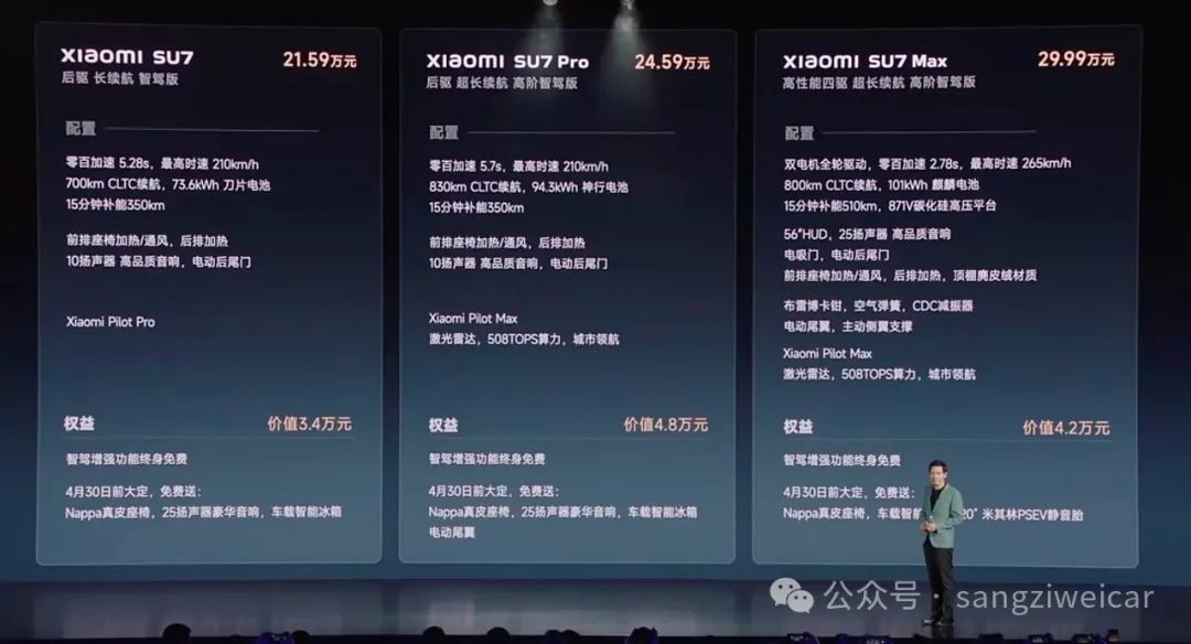 小米SU7车身尺寸为4997mm/1963mm/1440mm,轴距3000mm,从车型划分上看,小米SU7属于纯电中大型轿车细分市场,小米SU7主销车型定价区间在20-30万,旨在覆盖纯电中型轿车和中大型轿车的广泛消费者群体。不过对于纯电市场,不同的车企对这两个市场考虑不同,特斯拉只做一款车型即Model 3属于中型车细分市场;极氪做两款车型极氪001和极氪007,分别为中大型轿车细分市场和中型轿车细分市场,极氪两款产品定义和定价做的均比较合理,两款车型销量没有互相影响。小米SU7在车身尺寸上具有优势,定价与竞品相差不大时,在销售上具有一定的优势。