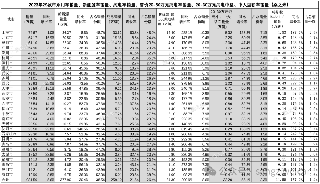 小米SU7首批网络覆盖29个城市2023年汽车销量为982万辆,占乘用车市场份额的45%,其中新能源销量近400万辆,占新能源整体销量的42%;纯电车型销量为259万辆,占纯电车型整体销量的53%;特斯拉Model 3在这29个城市的销量为11.6万辆。小米SU7在这29个城市潜在销量规模可以参考特斯拉Model 3在这些城市的销量。
