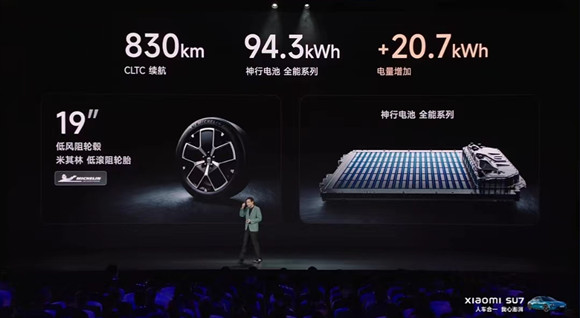 发布会现场展示的PPT显示,小米SU7 Pro将搭载神行电池全能系列,电量为94.3 KWh,续航里程为830公里。小米SU7 MAX搭载三元麒麟电池,电量为101 KWh,续航里程为800公里。