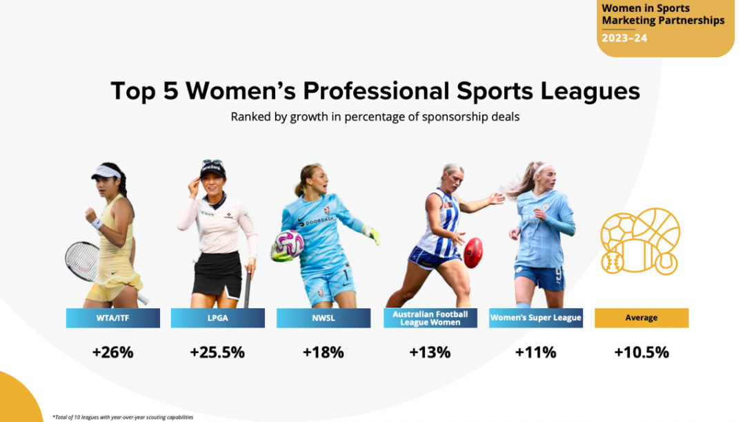过去一年里,全球女子职业体育联赛达成的赞助交易平均增长了10.5%,为这一领域带来了巨大的合作资源和机会。其中,网球联赛WTA/ATF的赞助交易共增长26%,高尔夫球联赛LPGA实现了25.5%的合作增长。