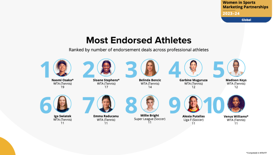 根据职业运动员的代言数量排名,大坂直美以19个代言稳居第一。斯隆·斯蒂芬斯、本西奇、斯瓦泰克、拉杜卡努等网球运动员包揽了前七的位置,大威廉姆斯排名第十。布莱特和亚历克西娅两位足球运动员是唯二进入前十的女性运动员。