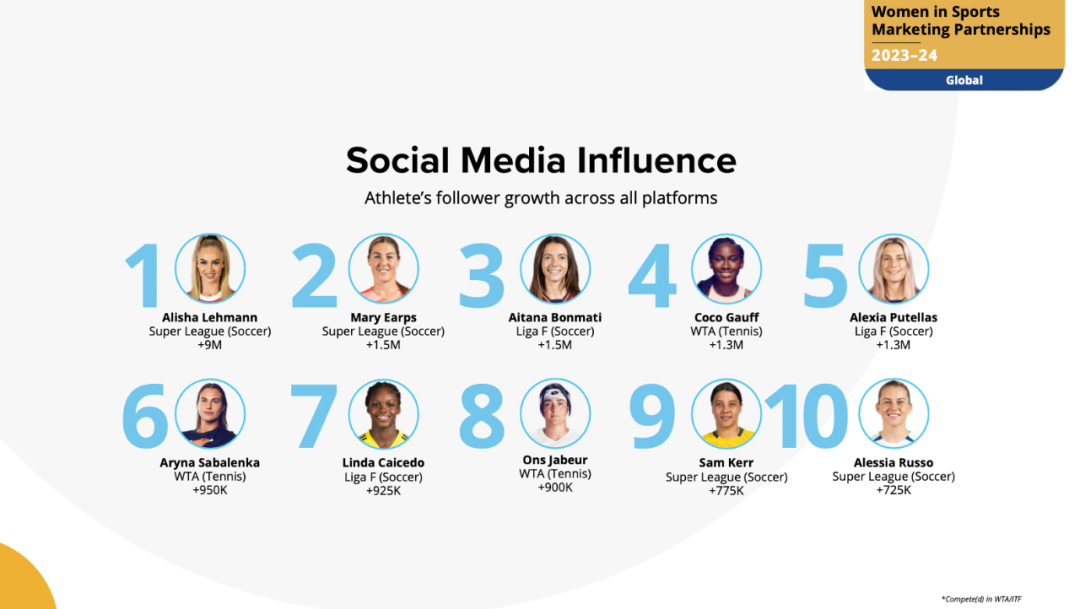不过,在社交媒体上,女子足球联赛的发展与曝光正在让越来越多的女性足球运动员得到关注。这一年,24岁的瑞士女足国脚阿丽莎-莱曼(Alisha Lehmann)、英格兰女足国家队守门员玛丽·厄普斯(Mary Earps)等七位足球运动员进入了社交媒体粉丝增长前十的位置。与她们一起的,是高芙、萨巴伦卡这样有巨大曝光优势的网球名将。
