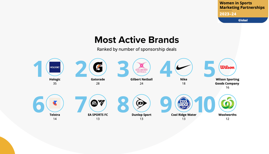 从全球赞助合作类别来看,服装与配饰类(229)、金融类(184)两个类别的赞助数量是最多的,但它们的交易更多集中在少数几个品牌上。子类别中,运动与鞋服、旅游、投资服务分列赞助数量前三。Hologic、佳得乐、耐克、威尔士等是最活跃的女性体育联赛赞助商。