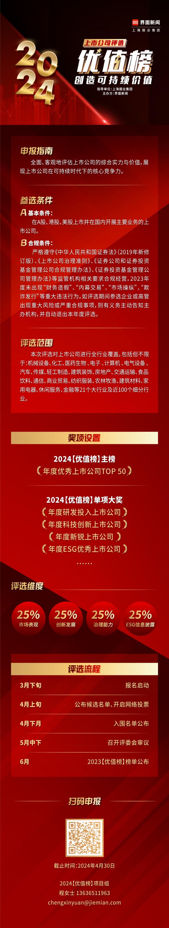 在此背景之下,由上海报业集团作为指导单位、界面新闻主办的2024【优值榜】评选于近日启动,旨在通过界面新闻在财经媒体中的领先影响力,基于上市公司研究理论与投资领域的多个经典模型,全面、客观地评估参评企业的综合实力与价值,最终评选出内在价值更高、更具有长期发展前景的上市公司。他们追求增长与效率,同时必须在一个充满不确定性的市场环境中保持战略的灵活性。评选过程中,组委会将遵循独立、客观、科学原则,通过评选征集、模型评价、网络投票、专家评审层层把关,以确保评选公正性与社会价值。