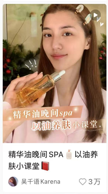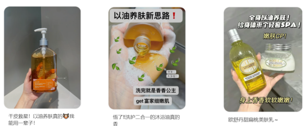 大量明星如伊能静、吴千语等也跟随这股趋势分享护肤心得,明星效应和社媒的热度吸引大批消费者跟风效仿,相关的面部精油、身体精油等产品受到关注,沐浴油就是其中一个进行全身肌肤护理的重要品类。