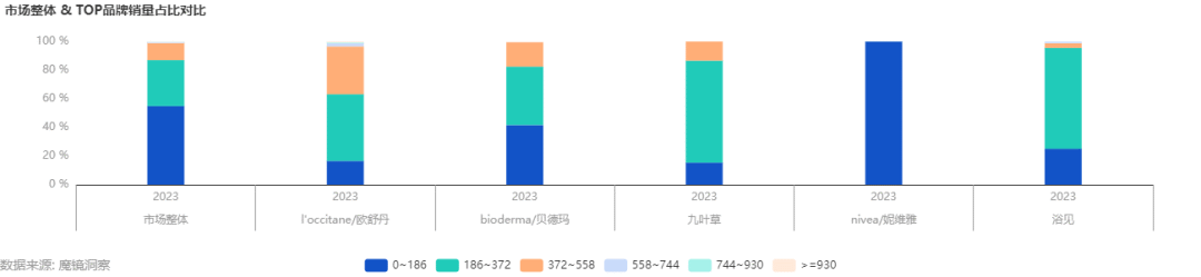 从各个价位段的销量情况来看,300元下的中低价位沐浴油仍是市场主流,仅有头部品牌布局300-500元价格较高的高端产品线。