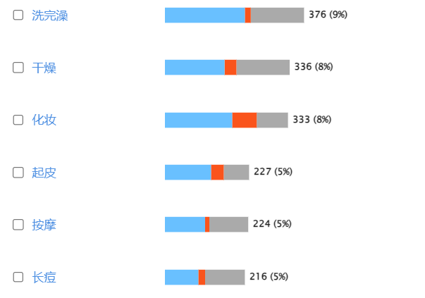通过对关键词分析,我们可以发现区别于传统沐浴露等产品,沐浴油往往在洗完澡后有较好的皮肤体验,且对于皮肤干燥、起皮等问题有较好的改善。另外值得关注的是沐浴油在按摩这一场景中的使用频率也比较高,通过使用该产品消费者可以享受肌肤SPA的持续滋润,得到身心放松。