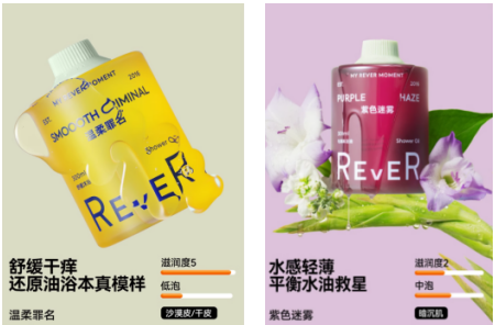 以Rever乐若沐浴油为例,根据不同皮肤肤质如暗沉肌、沙漠皮/干皮、鸡皮/粗糙/疙瘩肌、蛇皮/橘皮肌设计针对特定皮肤的不同功效的沐浴油,使消费者在选择沐浴油时更有针对性的改善肌肤问题,符合身体护理精细化的趋势。