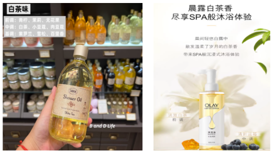 除了常见的茉莉、山茶、玫瑰等花香;柑橘、柠檬、白桃等水果香外,具有小众高级感的木质香与白茶香的沐浴油正受到越来越多消费者的青睐。