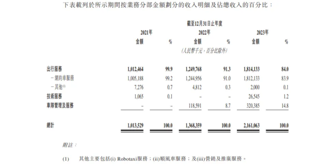收入方面,根据招股书披露,2021年至2023年,如祺出行总收入分别是10.14亿元、13.68亿元、21.61亿元,年复合增长率46%,其中出行服务收入分别为10.13亿元、12.50亿元、18.14亿元,年复合增长率为33.9%,是如祺出行的营收主力。