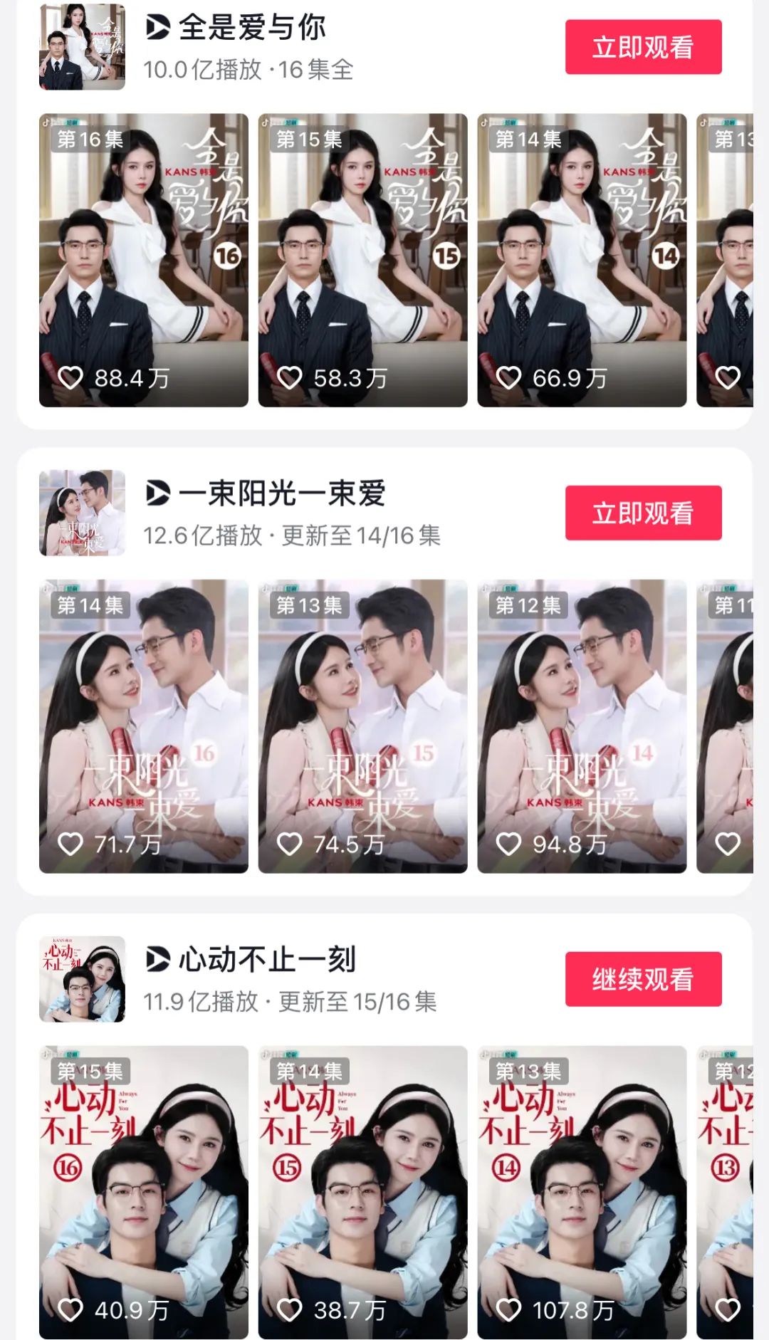 尝到微短剧营销的甜头后,韩束便一发不可收拾,之后又接连与姜十七合作了《心动不止一刻》《一束阳光一束爱》《全是爱与你》《你终将会红》四部微短剧,四部剧集市场表现都超越了《以成长来装束》,单部播放量破10亿,累计播放量达到44.6亿。算上《以成长来装束》,韩束成功靠五部微短剧撬动了50亿的流量。
