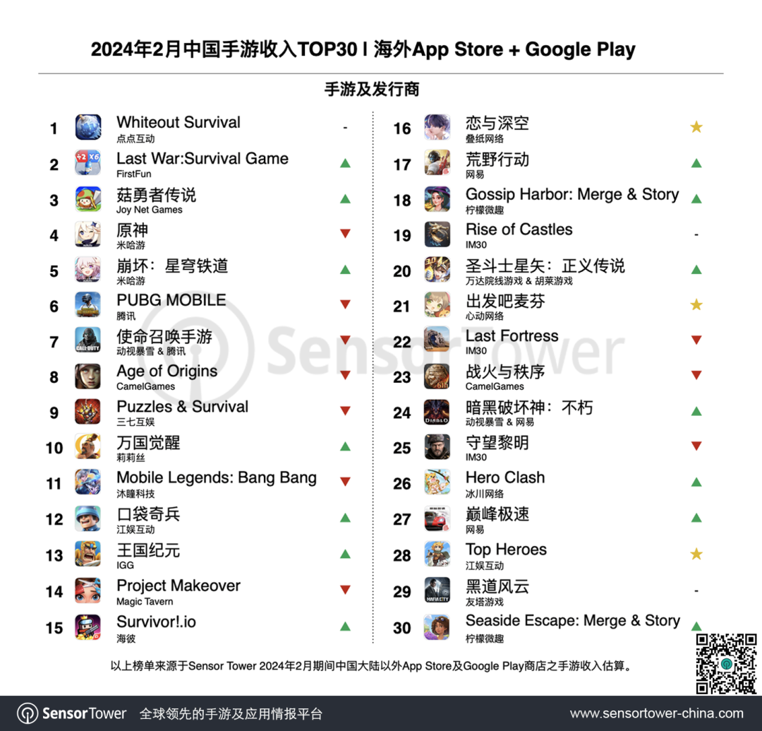 据SensorTower2024年1月及2月《中国手游收入TOP30》,《Whiteout Survival》已经击败《原神》和《PUBG MOBILE》,连续两月位列榜首。