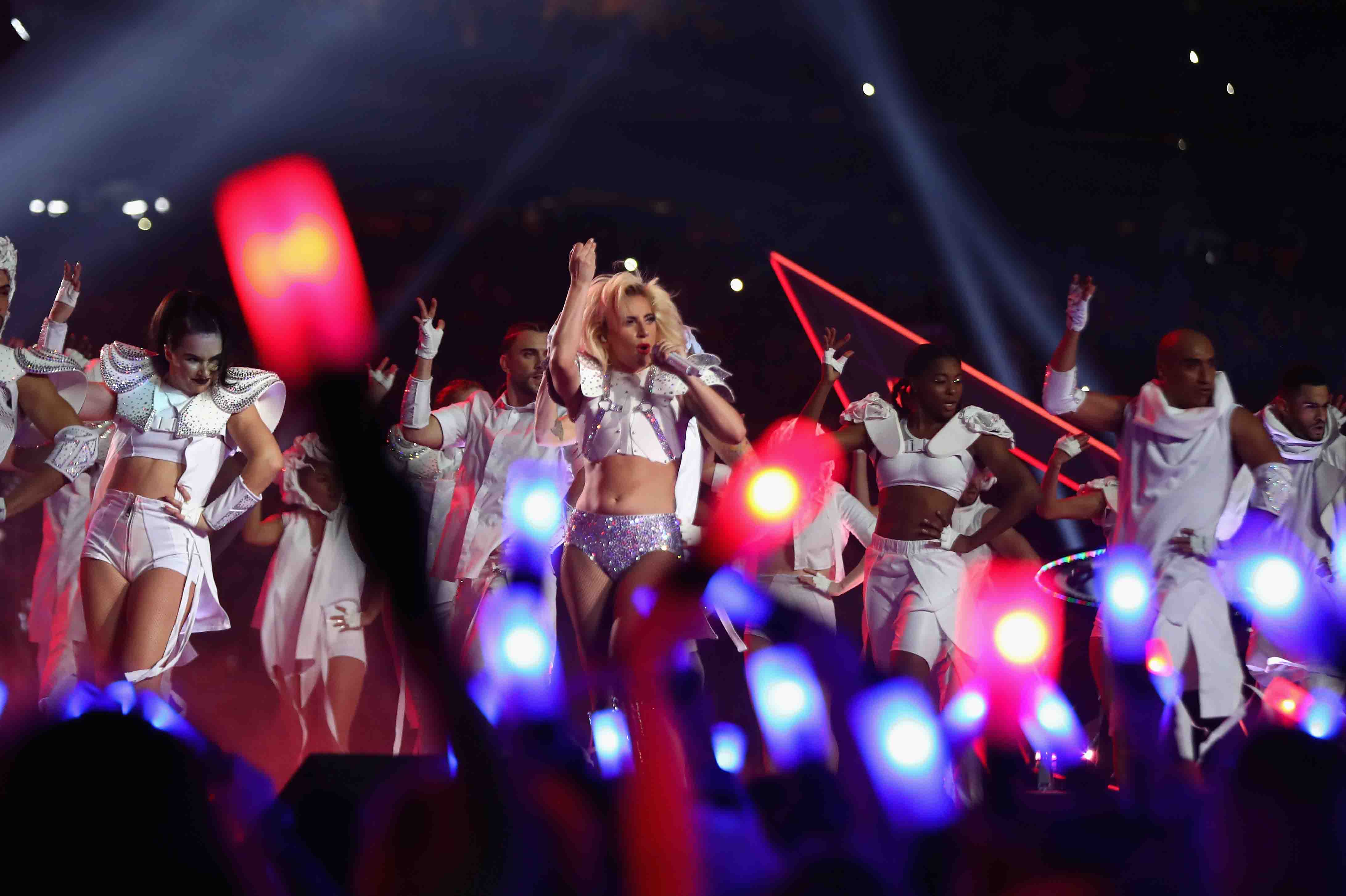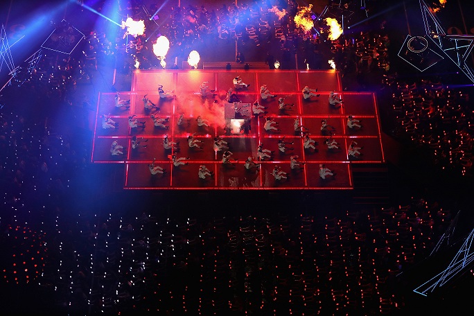 现场短暂的灭灯后,LADY GAGA迅速变装上身换成了露脐表演服,最后与伴舞劲歌热舞带来了成名之作《Bad romance》结束了中场秀。