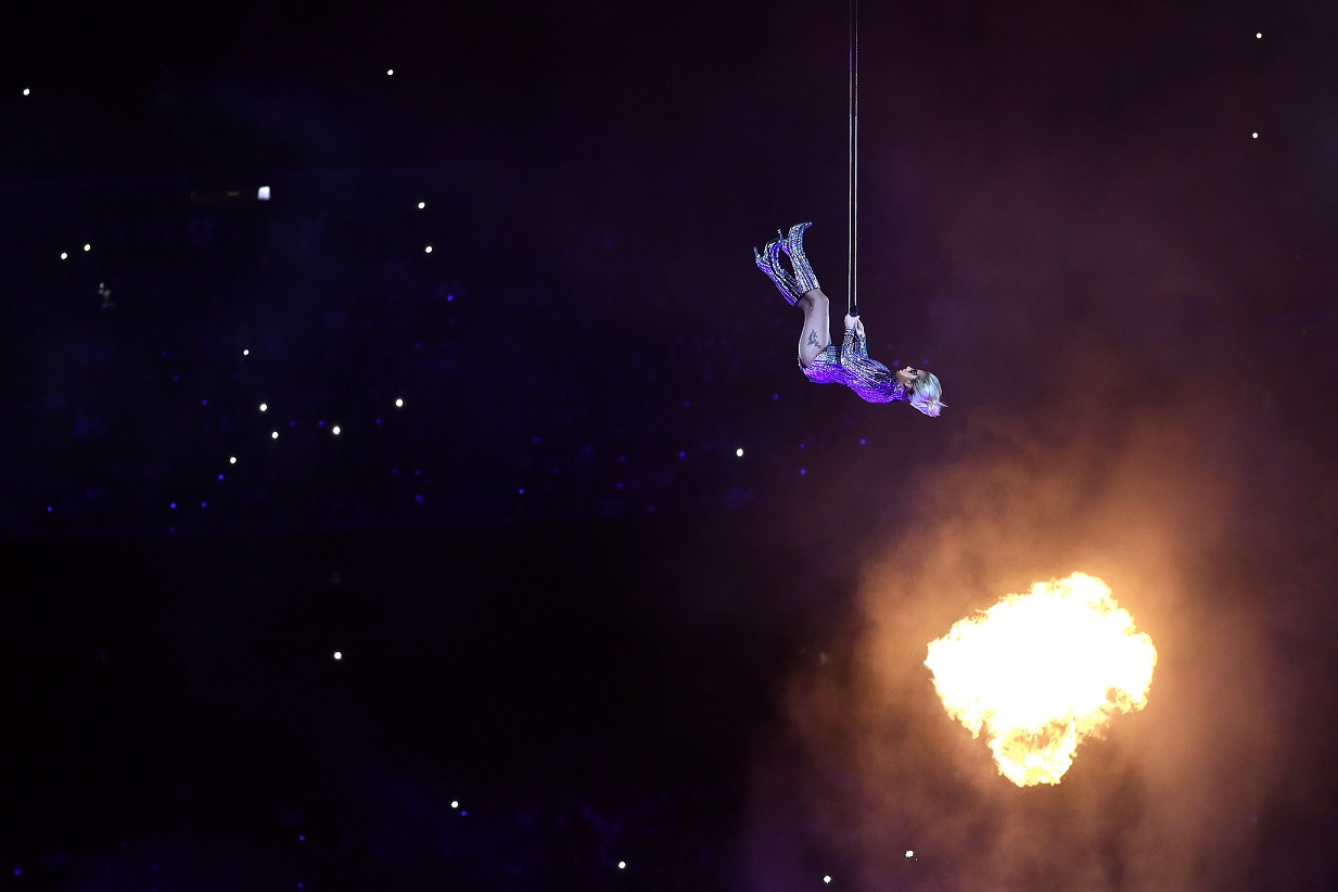 嘎嘎身穿银色表演服,先站着演唱了《God Bless America》和自己的经典作《Poker Face》,之后吊钢丝从空中一跃飞下,变身“空中飞人”燃爆全场。