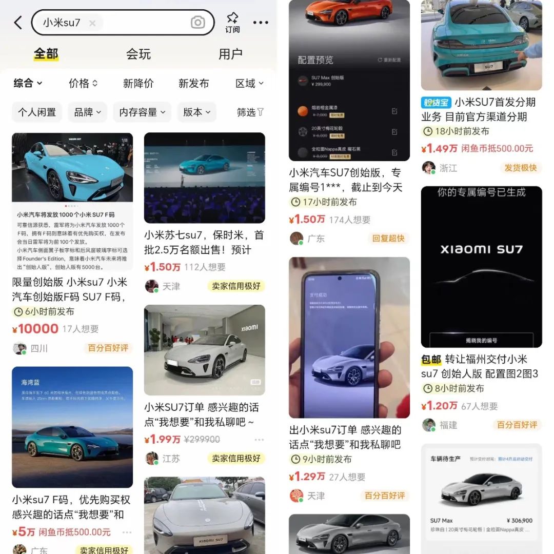 3月28日晚上十点发布会结束,两小时后,限量5000台的小米SU7创始版的购买资格已经在闲鱼陆续上线,大部分售价在1万左右。