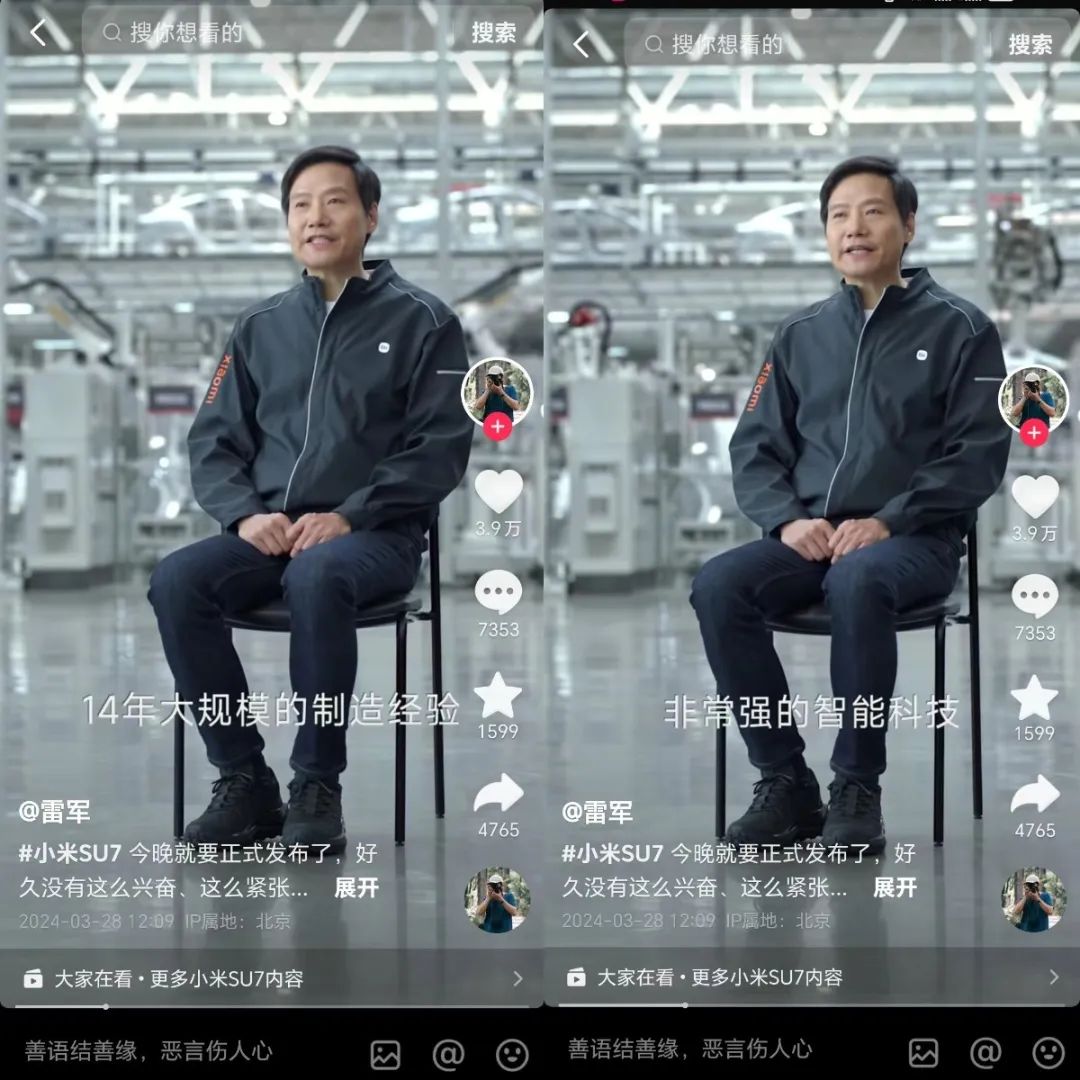 视频发布的当晚,雷军正要上台发表续航3小时、事后被他评价为“最累”的发布会。在那条视频下,他配的文案是:好久没有这么兴奋,这么紧张。